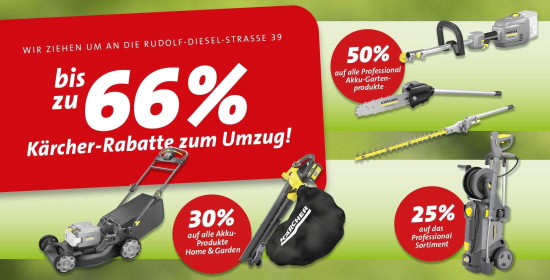 Nutzen Sie die letzten Tage an unserem bisherigen Standort, sichern Sie sich starke Angebote und freuen Sie sich auf unseren neuen Kärcher- und Garten-Technik-Standort in der Rudolf-Diesel-Straße.